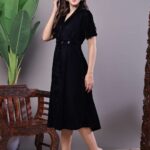 Women’s Black Velvet Solid Printed Shirt Midi Dress with Belt