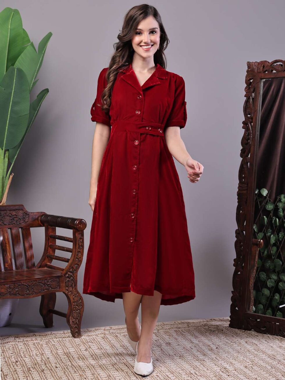 Women’s Maroon Velvet Solid Printed Shirt Midi Dress with Belt