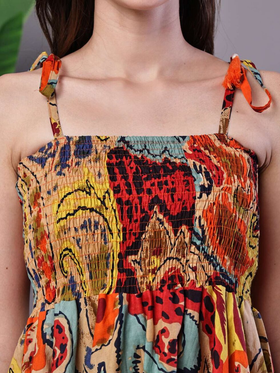 Effortlessly stylish dress with a vibrant abstract print, tie-up shoulder straps, and a chic high-low handkerchief hemline ? perfect for casual days or evening gatherings.